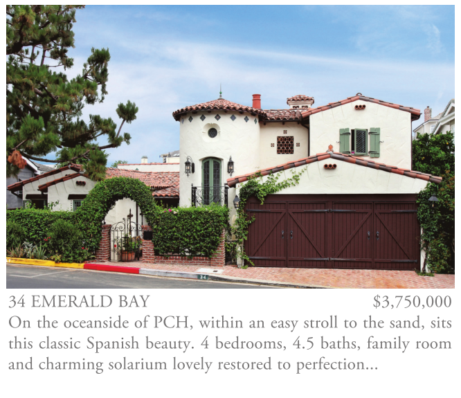 34 EMERALD BAY $3,750,000 On the oceanside of PCH, within an easy stroll to the sand, sits this classic Spanish beauty. 4 bedrooms, 4.5 baths, family room and charming solarium lovely restored to perfection...