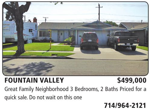 FOUNTAIN VALLEY $499,000 Great Family Neighborhood 3 Bedrooms, 2 Baths Priced for a quick sale. Do not wait on this one 714/964-2121