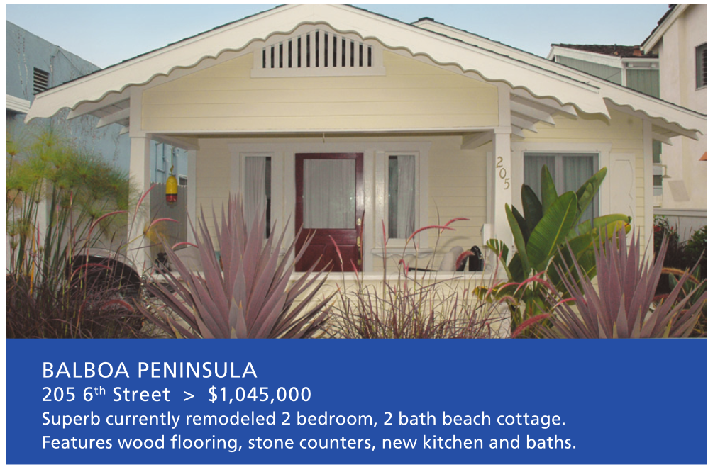 BALBOA PENINSULA 205 6 th Street > $1,045,000 Superb currently remodeled 2 bedroom, 2 bath beach cottage. Features wood flooring, stone counters, new kitchen and baths.