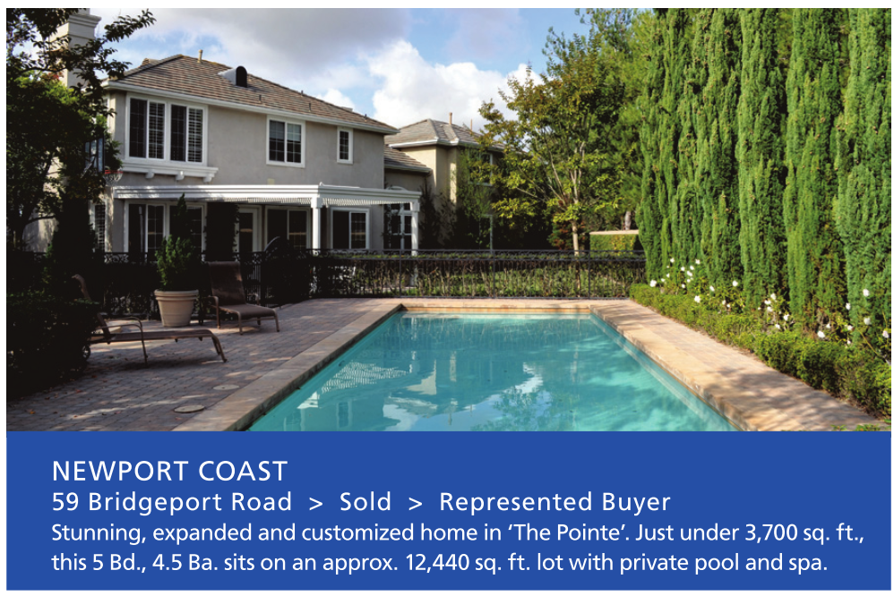 NEWPORT COAST 59 Bridgeport Road > Sold > Represented Buyer Stunning,expandedandcustomizedhomein‘ThePointe’.Justunder3,700sq.ft., this5Bd.,4.5Ba.sitsonanapprox.12,440sq.ft.lotwithprivatepoolandspa.