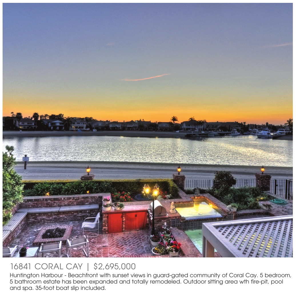 16841 CORAL CAY | $2,695,000 Huntington Harbour - Beachfront with sunset views in guard-gated community of Coral Cay. 5 bedroom, 5 bathroom estate has been expanded and totally remodeled. Outdoor sitting area wth fire-pit, pool and spa. 35-foot boat slip included.