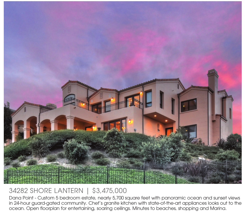 Dana Point - Custom 5 bedroom estate, nearly 5,700 square feet with panoramic ocean and sunset views in 24-hour guard-gated community. Chef’s granite kitchen with state-of-the-art appliances looks out to the ocean. Open floorplan for entertaining, soaring ceilings. Minutes to beaches, shopping and Marina.