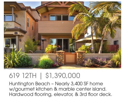 Huntington Beach – Nearly 3,400 SF home w/gourmet kitchen & marble center island. Hardwood flooring, elevator, & 3rd floor deck.