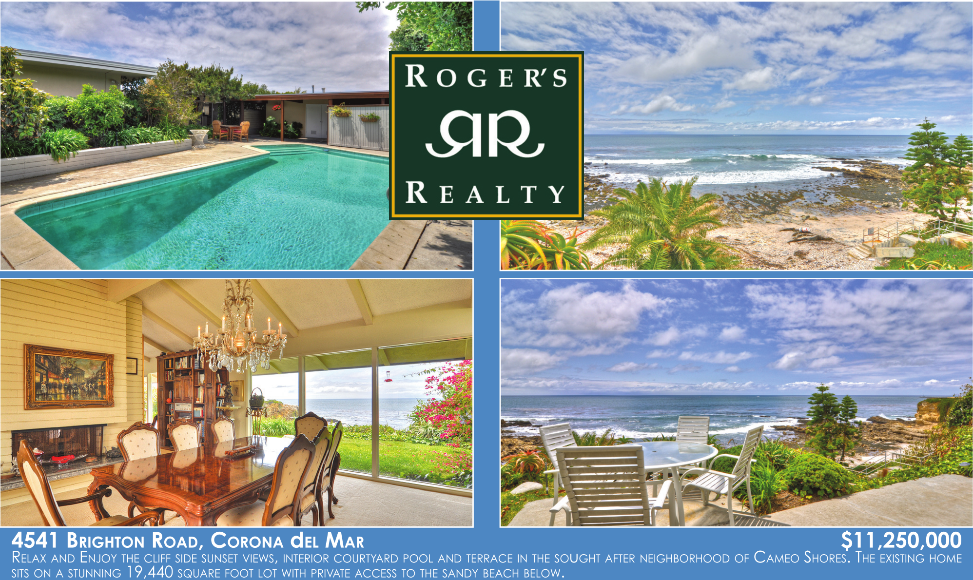 4541 BRIGHTON ROAD, CORONA dEL MAR $11,250,000 RELAX AND ENJOY THE CLIFF SIDE SUNSET VIEWS, INTERIOR COURTYARD POOL AND TERRACE IN THE SOuGHT AFTER NEIGHBORHOOD OF CAMEO SHORES. THE EXISTING HOME SITS ON A STUNNING 19,440 SQUARE FOOT LOT WITH PRIVATE ACCESS TO THE SANDY BEACH BELOW.