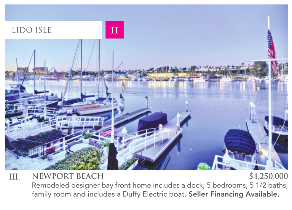 NEWPORT BEACH $4,250,000 Remodeled designer bay front home includes a dock, 5 bedrooms, 5 1/2 baths, family room and includes a Duffy Electric boat. Seller Financing Available.