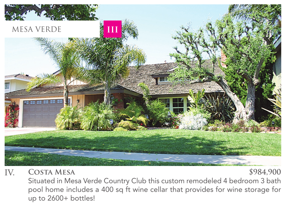 Costa Mesa $984,900 Situated in Mesa Verde Country Club this custom remodeled 4 bedroom 3 bath pool home includes a 400 sq ft wine cellar that provides for wine storage for up to 2600+ bottles!