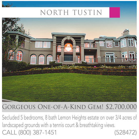 Secluded 5 bedrooms, 8 bath Lemon Heights estate on over 3/4 acres of landscaped grounds with a tennis court & breathtaking views. CALL (800) 387-1451 (528472)