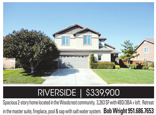 Spacious 2-story home located in the Woodcrest community. 3,263 SF with 4BD/3BA + loft. Retreat in the master suite, fireplace, pool & sap with salt water system. Bob Wright 951.686.7653