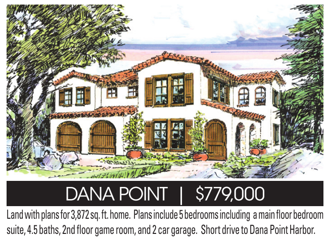 Land with plans for 3,872 sq. ft. home. Plans include 5 bedrooms including a main floor bedroom suite, 4.5 baths, 2nd floor game room, and 2 car garage. Short drive to Dana Point Harbor.