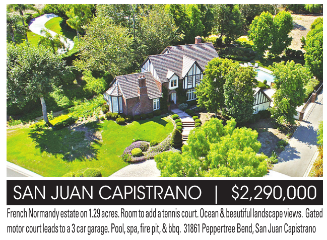French Normandy estate on 1.29 acres. Room to add a tennis court. Ocean & beautiful landscape views. Gated motor court leads to a 3 car garage. Pool, spa, fire pit, & bbq. 31861 Peppertree Bend, San Juan Capistrano
