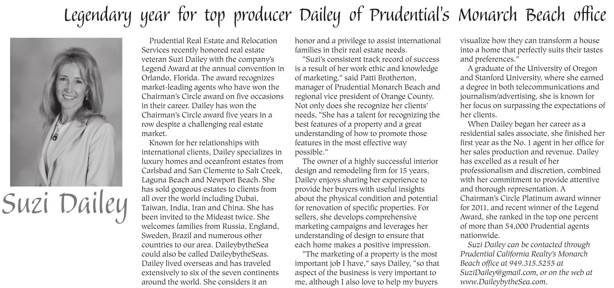 Suzi Dailey can be contacted through Prudential California Realty’s Monarch Beach office at 949.315.5255 at SuziDailey@gmail.com, or on the web at www.DaileybytheSea.com.