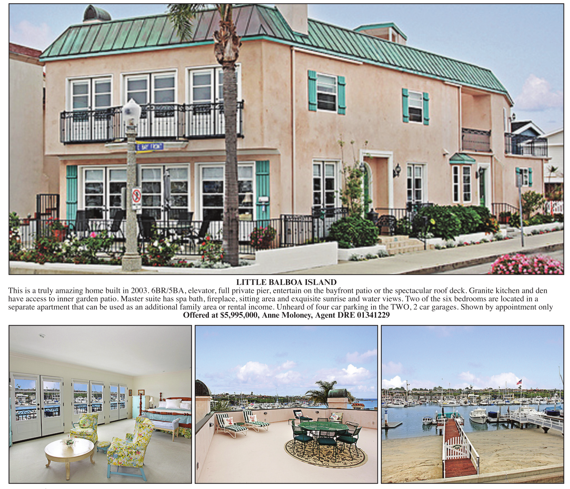 LITTLE BALBOA ISLAND This is a truly amazing home built in 2003. 6BR/5BA, elevator, full private pier, entertain on the bayfront patio or the spectacular roof deck. Granite kitchen and den have access to inner garden patio. Master suite has spa bath, fireplace, sitting area and exquisite sunrise and water views. Two of the six bedrooms are located in a separate apartment that can be used as an additional family area or rental income. Unheard of four car parking in the TWO, 2 car garages. Shown by appointment only Offered at $5,995,000, Anne Moloney, Agent DRE 01341229