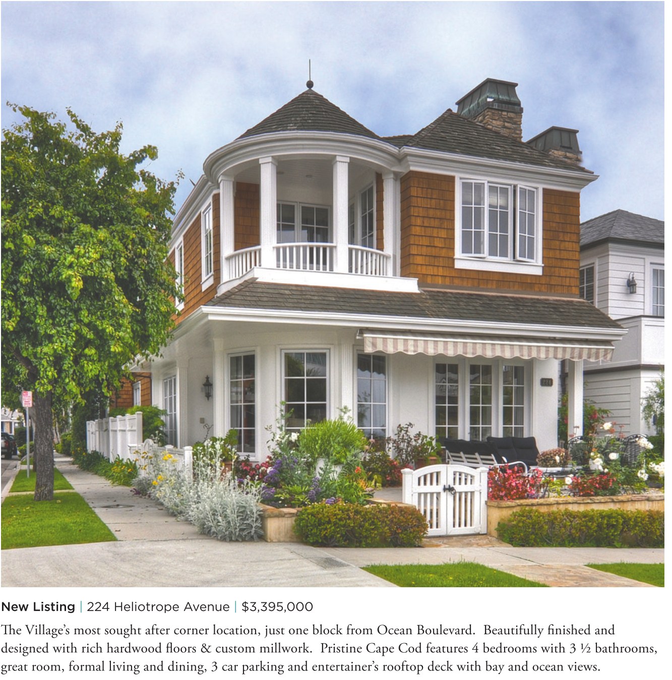 New Listing | 224 Heliotrope Avenue | $3,395,000 The Village’s most sought after corner location, just one block from Ocean Boulevard. Beautifully finished and designed with rich hardwood floors & custom millwork. Pristine Cape Cod features 4 bedrooms with 3 ½ bathrooms, great room, formal living and dining, 3 car parking and entertainer’s rooftop deck with bay and ocean views.