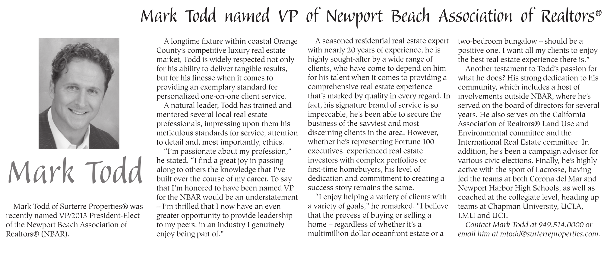 Mark Todd of Surterre Properties® was recently named VP/2013 President-Elect of the Newport Beach Association of Realtors® (NBAR).