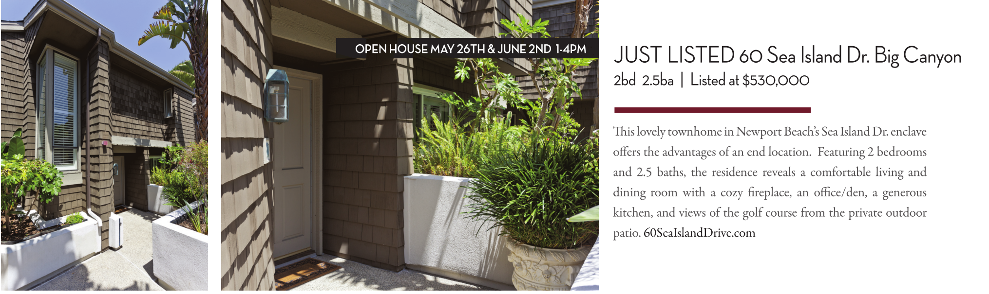 OPEN HOUSE MAY 26TH & JUNE 2ND 1-4PM JUST LISTED 60 Sea Island Dr. Big Canyon 2bd 2.5ba | Listed at $530,000 This lovely townhome in Newport Beach’s Sea Island Dr. enclave offers the advantages of an end location. Featuring 2 bedrooms and 2.5 baths, the residence reveals a comfortable living and dining room with a cozy fireplace, an office/den, a generous kitchen, and views of the golf course from the private outdoor patio. 60SeaIslandDrive.com