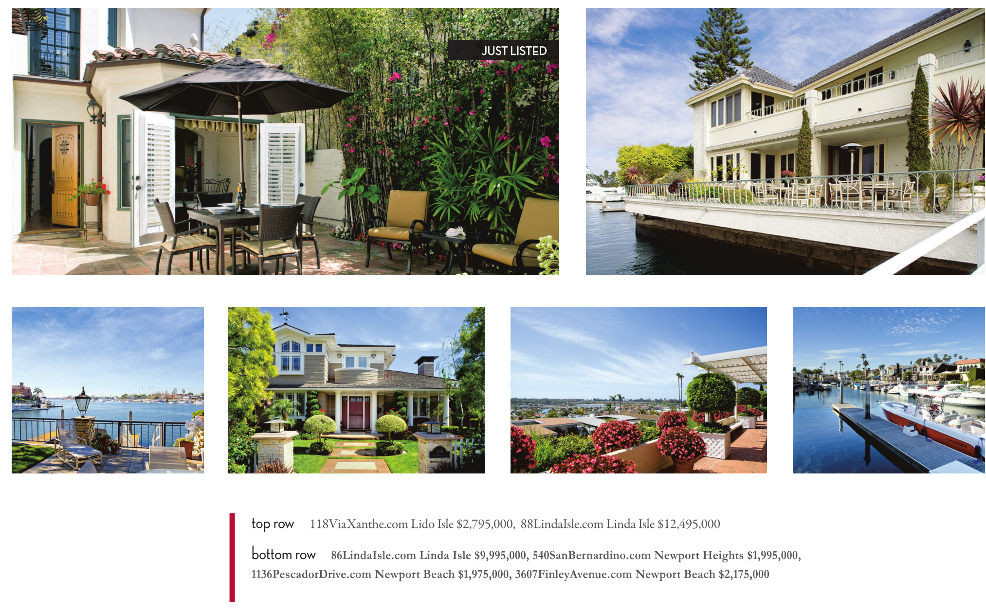 JUST LISTED top row 118ViaXanthe.com Lido Isle $2,795,000, 88LindaIsle.com Linda Isle $12,495,000 bottom row 86LindaIsle.com Linda Isle $9,995,000, 540SanBernardino.com Newport Heights $1,995,000, 1136PescadorDrive.com Newport Beach $1,975,000, 3607FinleyAvenue.com Newport Beach $2,175,000