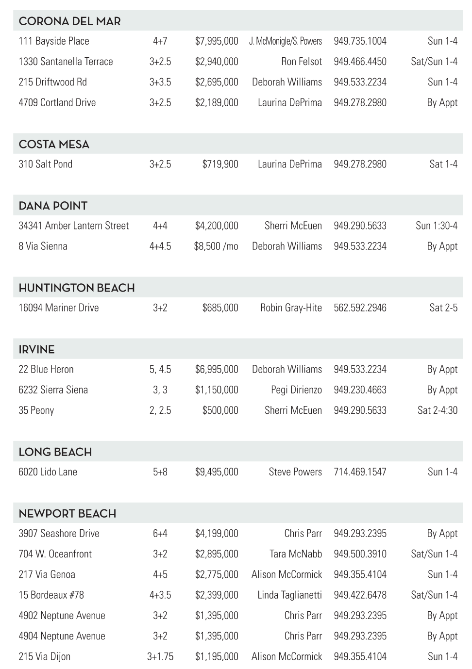 CORONA DEL MAR 111 Bayside Place 4+7 $7,995,000 J. McMonigle/S. Powers 949.735.1004 Sun 1-4 1330 Santanella Terrace 3+2.5 $2,940,000 Ron Felsot 949.466.4450 Sat/Sun 1-4 215 Driftwood Rd 3+3.5 $2,695,000 Deborah Williams 949.533.2234 Sun 1-4 4709 Cortland Drive 3+2.5 $2,189,000 Laurina DePrima 949.278.2980 By Appt