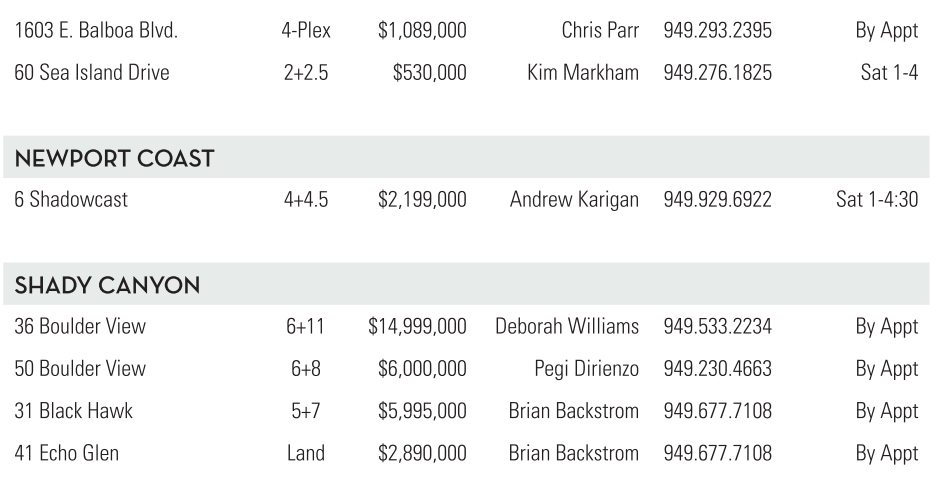 NEWPORT COAST 6 Shadowcast 4+4.5 $2,199,000 Andrew Karigan 949.929.6922 Sat 1-4:30