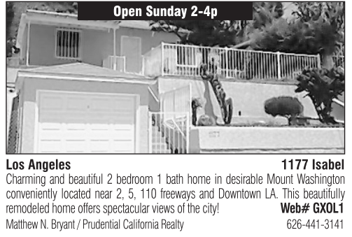 Open Sunday 2-4p Los Angeles 1177 Isabel Charming and beautiful 2 bedroom 1 bath home in desirable Mount Washington conveniently located near 2, 5, 110 freeways and Downtown LA. This beautifully remodeled home offers spectacular views of the city! Web# GXOL1 Matthew N. Bryant / Prudential California Realty 626-441-3141