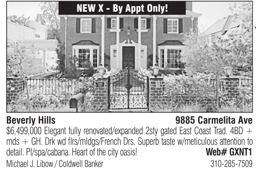 Beverly Hills 9885 Carmelita Ave $6,499,000 Elegant fully renovated/expanded 2sty gated East Coast Trad. 4BD + mds + GH. Drk wd flrs/mldgs/French Drs. Superb taste w/meticulous attention to detail. Pl/spa/cabana. Heart of the city oasis! Web# GXNT1 NEW X - By Appt Only! Michael J. Libow / Coldwell Banker 310-285-7509