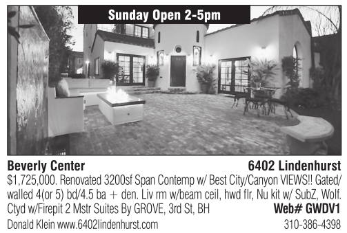 Sunday Open 2-5pm Beverly Center 6402 Lindenhurst $1,725,000. Renovated 3200sf Span Contemp w/ Best City/Canyon VIEWS!! Gated/ walled 4(or 5) bd/4.5 ba + den. Liv rm w/beam ceil, hwd flr, Nu kit w/ SubZ, Wolf. Ctyd w/Firepit 2 Mstr Suites By GROVE, 3rd St, BH Web# GWDV1 Donald Klein www.6402lindenhurst.com 310-386-4398