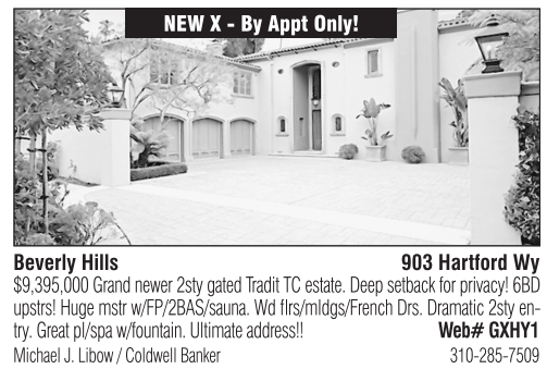 NEW X - By Appt Only! Beverly Hills 903 Hartford Wy $9,395,000 Grand newer 2sty gated Tradit TC estate. Deep setback for privacy! 6BD upstrs! Huge mstr w/FP/2BAS/sauna. Wd flrs/mldgs/French Drs. Dramatic 2sty en- try. Great pl/spa w/fountain. Ultimate address!! Web# GXHY1 Michael J. Libow / Coldwell Banker 310-285-7509 See also