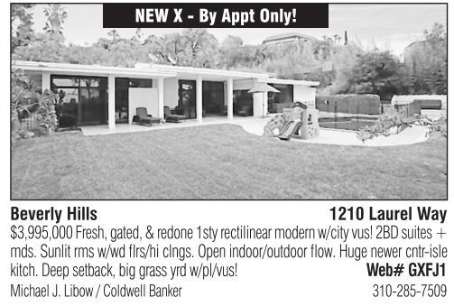 NEW X - By Appt Only! Beverly Hills 1210 Laurel Way $3,995,000 Fresh, gated, & redone 1sty rectilinear modern w/city vus! 2BD suites + mds. Sunlit rms w/wd flrs/hi clngs. Open indoor/outdoor flow. Huge newer cntr-isle kitch. Deep setback, big grass yrd w/pl/vus! Web# GXFJ1 Michael J. Libow / Coldwell Banker 310-285-7509 See also