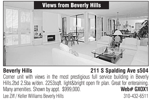 Views from Beverly Hills Beverly Hills 211 S Spalding Ave s504 Corner unit with views in the most prestigious full service building in Beverly Hills.2bd 2.5ba w/den. 2253sqft. light&bright open flr plan. Great for enteraining. Many amenities. Shown by appt. $999,000. Web# GXOX1 Lee Ziff / Keller Williams Beverly Hills 310-432-6511