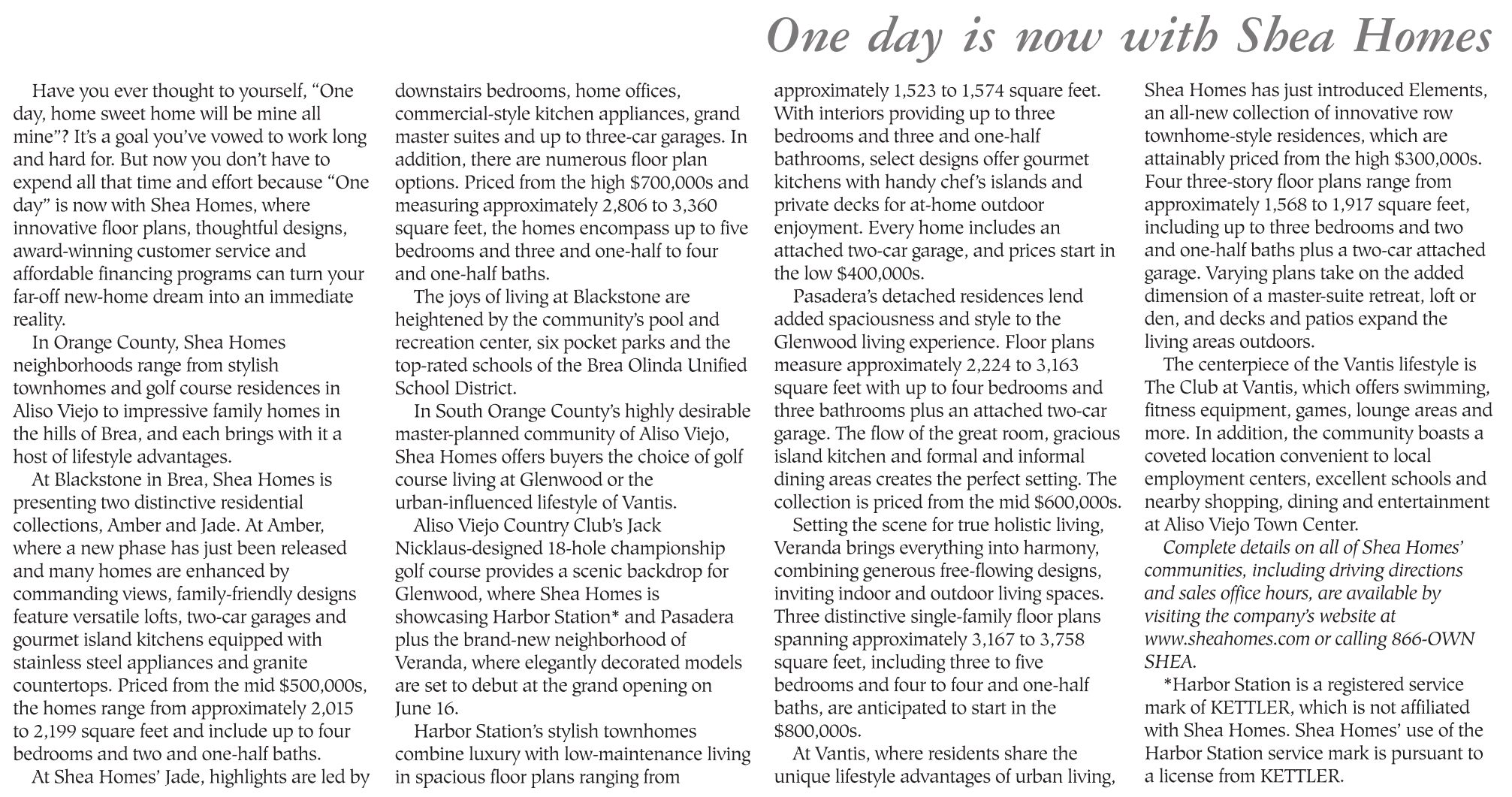 Complete details on all of Shea Homes’ communities, including driving directions and sales office hours, are available by visiting the company’s website at www.sheahomes.com or calling 866-OWN SHEA.