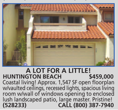 A LOT FOR A LITTLE! HUNTINGTON BEACH $459,000 Coastal living! Approx. 1,547 SF open floorplan w/vaulted ceilings, recessed lights, spacious living room w/wall of windows opening to enclosed lush landscaped patio, large master. Pristine! (528233) CALL (800) 387-7940