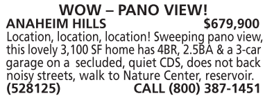 WOW – PANO VIEW! ANAHEIM HILLS $679,900 Location, location, location! Sweeping pano view, this lovely 3,100 SF home has 4BR, 2.5BA & a 3-car garage on a secluded, quiet CDS, does not back noisy streets, walk to Nature Center, reservoir. (528125) CALL (800) 387-1451