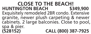 HUNTINGTON BEACH $349,900 Exquisitely remodeled 2BR condo. Extensive granite, newer plush carpeting & newer cabinets. 2 large balconies. Close to pool, spa & pier.