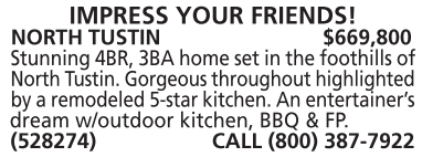 NORTH TUSTIN $669,800 Stunning 4BR, 3BA home set in the foothills of North Tustin. Gorgeous throughout highlighted by a remodeled 5-star kitchen. An entertainer’s dream w/outdoor kitchen, BBQ & FP. (528274) CALL (800) 387-7922