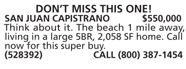 SAN JUAN CAPISTRANO $550,000 Think about it. The beach 1 mile away, living in a large 5BR, 2,058 SF home. Call now for this super buy. (528392) CALL (800) 387-1454