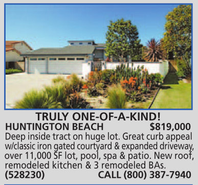 HUNTINGTON BEACH $819,000 Deep inside tract on huge lot. Great curb appeal w/classic iron gated courtyard & expanded driveway, over 11,000 SF lot, pool, spa & patio. New roof, remodeled kitchen & 3 remodeled BAs. (528230) CALL (800) 387-7940