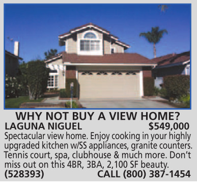 WHY NOT BUY A VIEW HOME? LAGUNA NIGUEL $549,000 Spectacular view home. Enjoy cooking in your highly upgraded kitchen w/SS appliances, granite counters. Tennis court, spa, clubhouse & much more. Don’t miss out on this 4BR, 3BA, 2,100 SF beauty. (528393) CALL (800) 387-1454