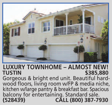 LUXURY TOWNHOME – ALMOST NEW! TUSTIN $385,880 Gorgeous & bright end unit. Beautiful hardwood floors, living room w/FP & media niche, kitchen w/large pantry & breakfast bar. Spacious balcony for entertaining. Standard sale. (528439) CALL (800) 387-7930