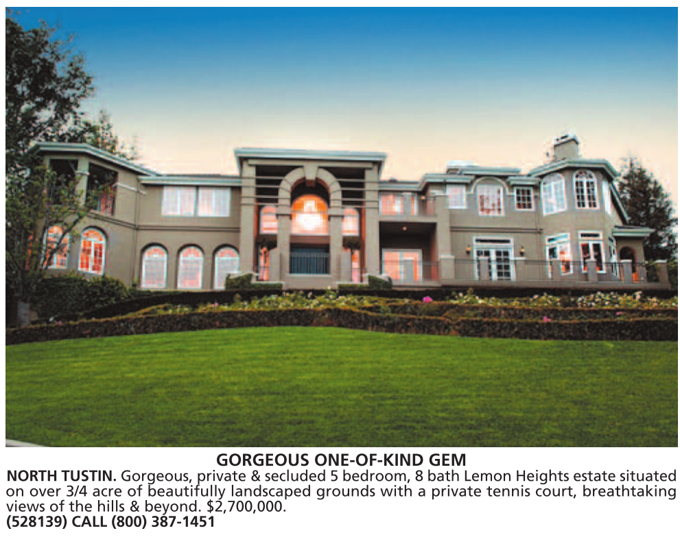 GORGEOUS ONE-OF-KIND GEM NORTH TUSTIN. Gorgeous, private & secluded 5 bedroom, 8 bath Lemon Heights estate situated on over 3/4 acre of beautifully landscaped grounds with a private tennis court, breathtaking views of the hills & beyond. $2,700,000. (528139) CALL (800) 387-1451