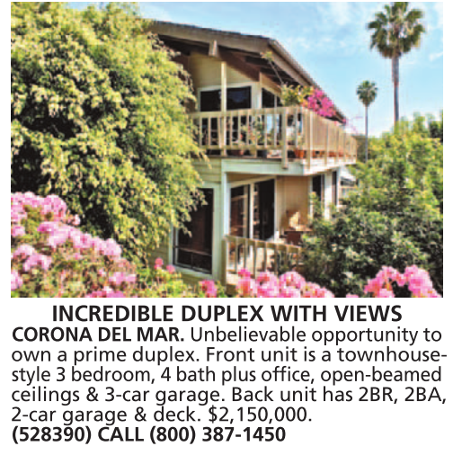 INCREDIBLE DUPLEX WITH VIEWS CORONA DEL MAR. Unbelievable opportunity to own a prime duplex. Front unit is a townhousestyle 3 bedroom, 4 bath plus office, open-beamed ceilings & 3-car garage. Back unit has 2BR, 2BA, 2-car garage & deck. $2,150,000. (528390) CALL (800) 387-1450