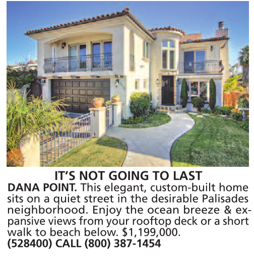 w/FP, IT’S NOT GOING TO LAST DANA POINT. This elegant, custom-built home sits on a quiet street in the desirable Palisades neighborhood. Enjoy the ocean breeze & expansive views from your rooftop deck or a short walk to beach below. $1,199,000. (528400) CALL (800) 387-1454