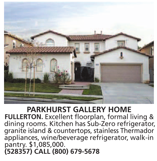 room. PARKHURST GALLERY HOME FULLERTON. Excellent floorplan, formal living & dining rooms. Kitchen has Sub-Zero refrigerator, granite island & countertops, stainless Thermador appliances, wine/beverage refrigerator, walk-in pantry. $1,085,000. (528357) CALL (800) 679-5678