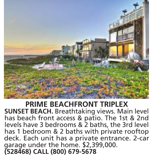 trail, PRIME BEACHFRONT TRIPLEX SUNSET BEACH. Breathtaking views. Main level has beach front access & patio. The 1st & 2nd levels have 3 bedrooms & 2 baths, the 3rd level has 1 bedroom & 2 baths with private rooftop deck. Each unit has a private entrance. 2-car garage under the home. $2,399,000. (528468) CALL (800) 679-5678