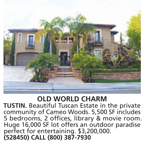 OLD WORLD CHARM TUSTIN. Beautiful Tuscan Estate in the private community of Cameo Woods. 5,500 SF includes 5 bedrooms, 2 offices, library & movie room. Huge 16,000 SF lot offers an outdoor paradise perfect for entertaining. $3,200,000. (528450) CALL (800) 387-7930