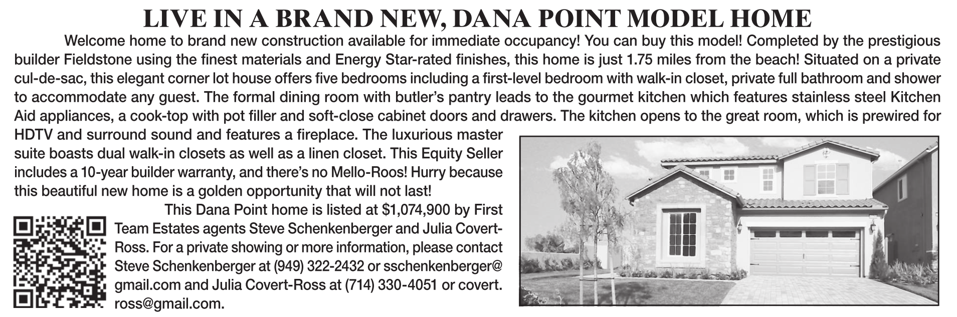 LIVE IN A BRAND NEW, DANA POINT MODEL HOME Welcome home to brand new construction available for immediate occupancy! You can buy this model! Completed by the prestigious builder Fieldstone using the finest materials and Energy Star-rated finishes, this home is just 1.75 miles from the beach! Situated on a private cul-de-sac, this elegant corner lot house offers five bedrooms including a first-level bedroom with walk-in closet, private full bathroom and shower to accommodate any guest. The formal dining room with butler’s pantry leads to the gourmet kitchen which features stainless steel Kitchen Aid appliances, a cook-top with pot filler and soft-close cabinet doors and drawers. The kitchen opens to the great room, which is prewired for HDTV and surround sound and features a fireplace. The luxurious master suite boasts dual walk-in closets as well as a linen closet. This Equity Seller includes a 10-year builder warranty, and there’s no Mello-Roos! Hurry because this beautiful new home is a golden opportunity that will not last! This Dana Point home is listed at $1,074,900 by First Team Estates agents Steve Schenkenberger and Julia Covert- Ross. For a private showing or more information, please contact Steve Schenkenberger at (949) 322-2432 or sschenkenberger@ gmail.com and Julia Covert-Ross at (714) 330-4051 or covert. ross@gmail.com.