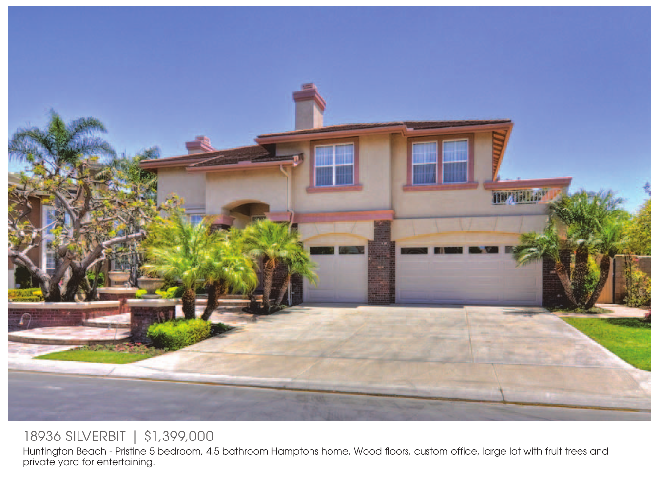 Huntington Beach - Pristine 5 bedroom, 4.5 bathroom Hamptons home. Wood floors, custom office, large lot with fruit trees and private yard for entertaining.