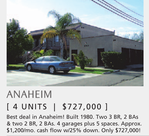 Best deal in Anaheim! Built 1980. Two 3 BR, 2 BAs & two 2 BR, 2 BAs. 4 garages plus 5 spaces. Approx. $1,200/mo. cash flow w/25% down. Only $727,000!