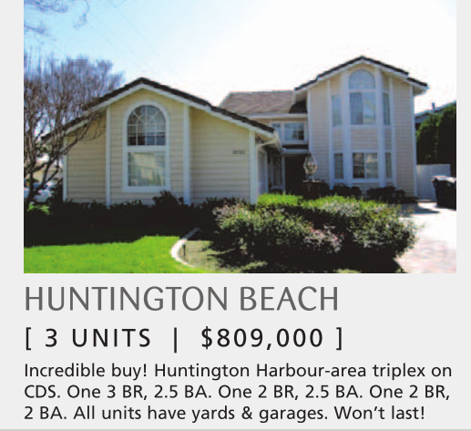 Incredible buy! Huntington Harbour-area triplex on CDS. One 3 BR, 2.5 BA. One 2 BR, 2.5 BA. One 2 BR, 2 BA. All units have yards & garages. Won’t last!