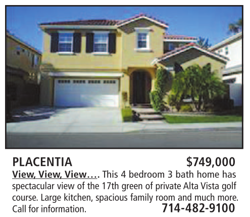 PLACENTIA $749,000 View, View, View…. This 4 bedroom 3 bath home has spectacular view of the 17th green of private Alta Vista golf course. Large kitchen, spacious family room and much more. Call for information. 714-482-9100