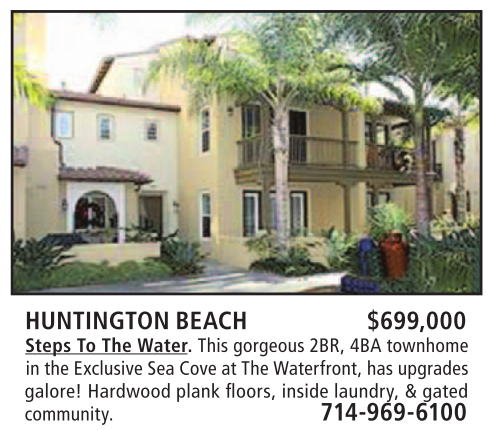 HUNTINGTON BEACH $699,000 Steps To The Water. This gorgeous 2BR, 4BA townhome in the Exclusive Sea Cove at The Waterfront, has upgrades galore! Hardwood plank floors, inside laundry, & gated community. 714-969-6100