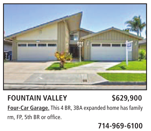FOUNTAIN VALLEY $629,900 Four-Car Garage. This 4 BR, 3BA expanded home has family rm, FP, 5th BR or office.